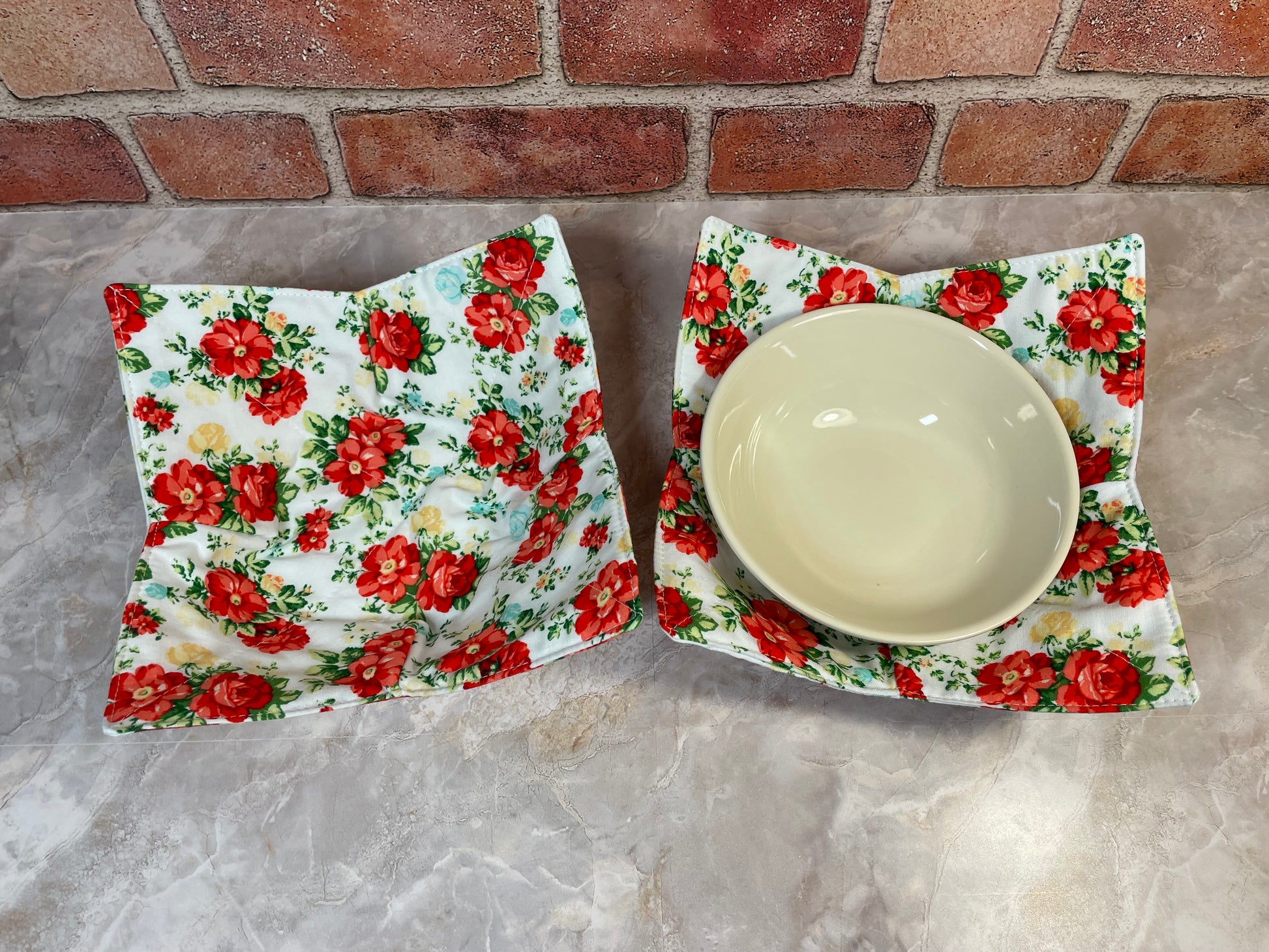 Quilted 100% cotton microwaveable soup bowl cozy, handmade for convenience and protection. Perfect for keeping your fingers safe from hot bowls in the microwave or from freezing while enjoying a bowl of ice cream. Bowl cozies may have a coordinating fabric on back side. The small size fits most cereal/soup size bowls, while the large size is ideal for pasta bowls. For gifts, a small cozy is a great choice since it’s the most frequently used size. I’ve found it handy to store them in the microwave, as I use a cozy 95% of the time I use the microwave. How to use and clean your cozy: Place your bowl of food in the cozy, then put into the microwave. Heat as usual, in 1–2-minute intervals. Carefully remove holding the corners of the cozy, as the food will be hot. Made from 100% cotton, the cozy can be machine washed. For best results, use cold water and air dry. (Do NOT use fabric softener)